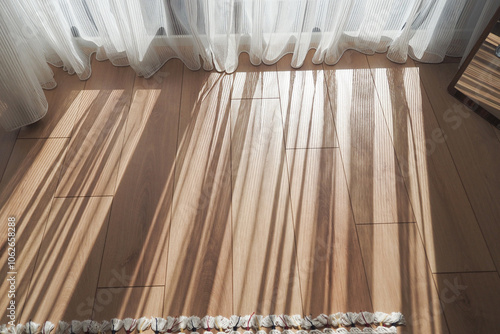Sunlight on the wooden floor with sheer curtains creates a serene, inviting atmosphere