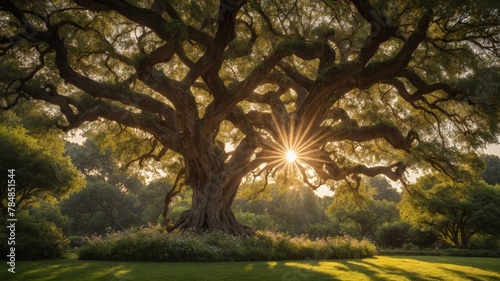 Sunlight pierces through intricate branches of majestic, ancient oak tree, casting warm glow that illuminates lush greenery surrounding it. Tree stands as testament to time, its gnarled.