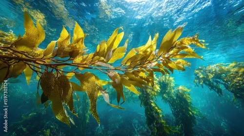 Sunlight pierces through the clear water, illuminating an underwater kelp forest with vibrant, greenish-yellow leaves swaying gently with the current.