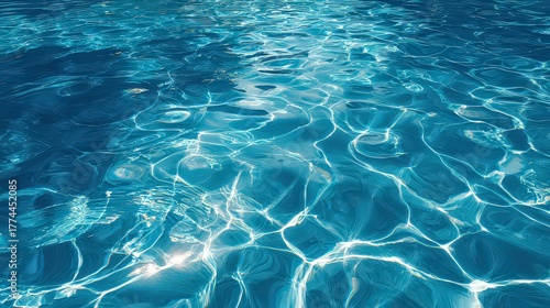 Sunlight Reflecting on Turquoise Blue Pool Water Creates Abstract Pattern with Caustic Ripples and Sparkling Highlights in Summer Vacation Scene