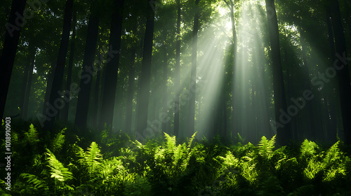 Sunlight shining through trees in a lush forest with vibrant ferns.