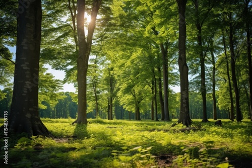Sunlight streaming through a dense green canopy in a vibrant and lush forest landscape