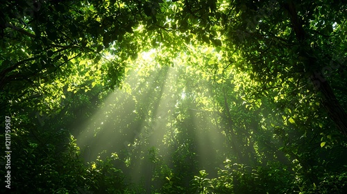 Sunlight Streaming Through Lush Green Forest Canopy in Nature