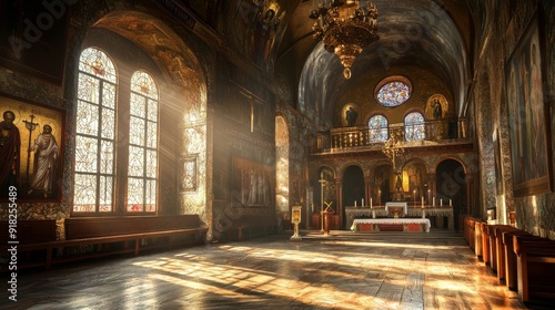 Sunlight Streaming Through Stained Glass Windows in a Cathedral Interior - A beautiful cathedral interior with sunlight streaming through stained glass windows, casting a warm glow on the wooden pews