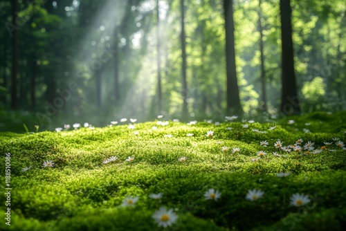 Sunlight streaming through trees in a lush green forest creating dappled light