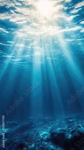 Sunlight streams down through ocean water, illuminating seabed with visible rays and cloudy surface
