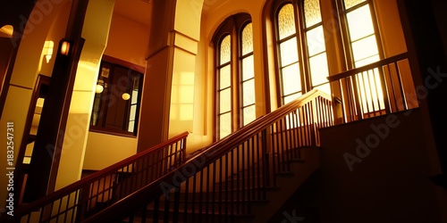 Sunlight streams into a grand, wooden staircase