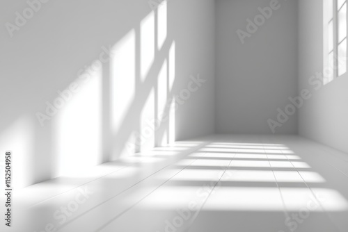 Sunlight streams into a minimalist white room, casting shadows on the floor and walls.