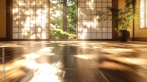 Sunlight streams into a serene Japanese-style room. Wooden floor reflects golden light through shoji screens, highlighting the tranquil garden beyond