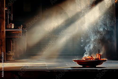 Sunlight streams through a dark space illuminating a smoking bowl creating an ethereal mysterious atmosphere.