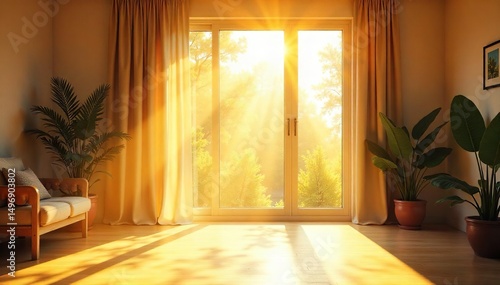 Sunlight streams through a large window, illuminating a bright and airy interior space Dust motes dance in the golden rays, creating a feeling of warmth and openness , interior, bright