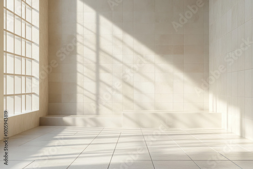 Sunlight streams through a large window into an empty room with white tiled walls, creating a serene atmosphere. Perfect for showcasing natural light and minimalist style