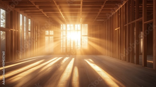 Sunlight streams through a wooden frame, illuminating an empty interior space.