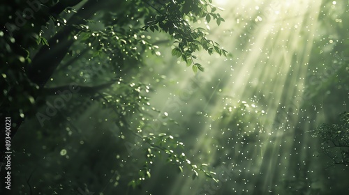 Sunlight streams through dense foliage, illuminating a lush green forest after a rain shower.