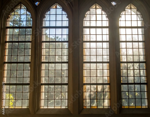 Sunlight streams through four arched, multi-paned windows in an old building. The image evokes a sense of history and tranquility.
