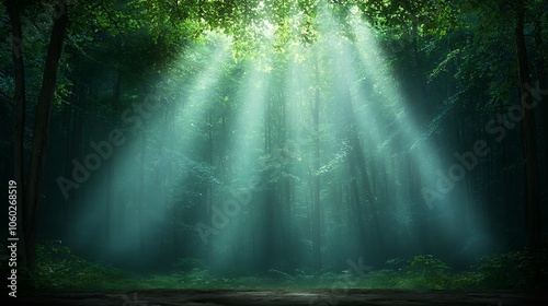 Sunlight streams through lush forest canopy illuminating nature's beauty and serenity
