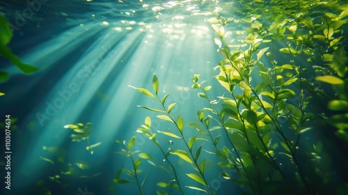 Sunlight streams through lush underwater plants, casting a tranquil glow in the aquatic landscape, creating a peaceful ambiance perfect for text placement.