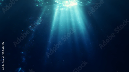 Sunlight streams through ocean waves, creating a mesmerizing play of light and shadow in deep blue waters.