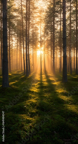 Sunlight streams through tall trees in a forest, casting long shadows across the mossy ground, creating a serene and ethereal atmosphere.