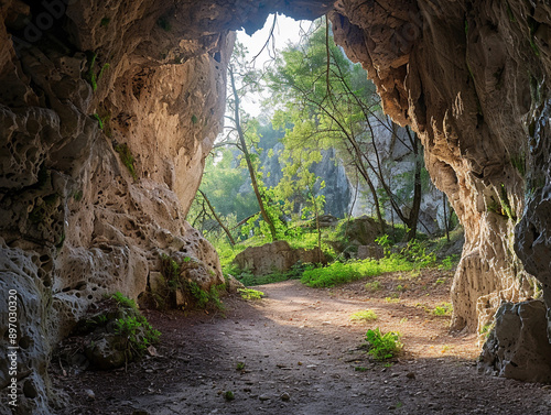 Sunlight Through A Cave Entrance In A Green Forest