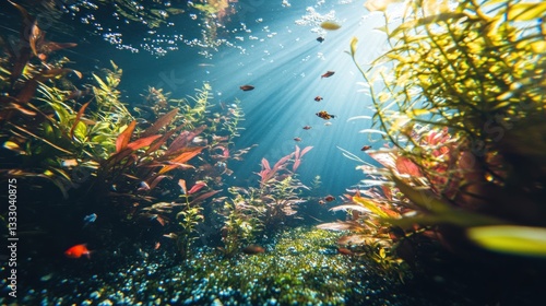 Sunlit Aquarium Scene with Fish and Lush Aquatic Vegetation