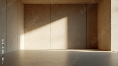 Sunlit architectural space featuring smooth walls and flooring, enhanced by natural light and shadows for a minimalist and serene aesthetic. Interior design concept.