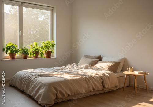 Sunlit Bedroom Interior with Plants and Cozy Bed