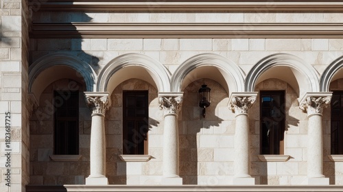 Sunlit Classical Facade with Arched Windows and Corinthian Columns
