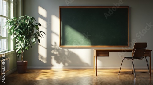 Sunlit classroom empty desk, chalkboard, plant, morning light, education