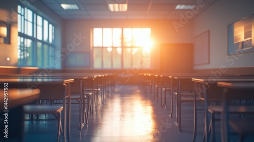 Sunlit classroom interior with rows of empty desks and chairs at sunset