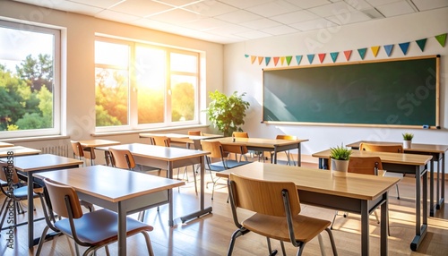 Sunlit classroom ready for students, desks arranged, chalkboard, windows showing trees.