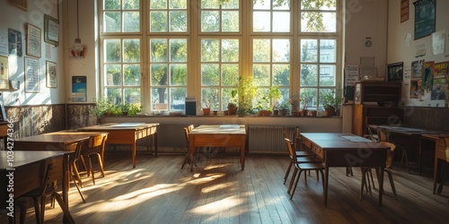Sunlit classroom with wooden desks and large windows, creating a warm, inviting atmosphere for learning and growth in an educational setting.