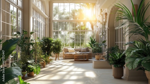 Sunlit conservatory with abundant potted plants, a woven sofa, and a low table, creating a tranquil and lush indoor garden space. Large windows showcase a verdant outdoor view