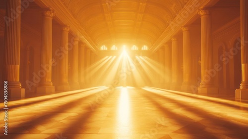 Sunlit corridor with towering pillars and a bright end.