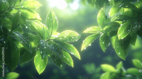 Sunlit Dewdrops on Lush Green Leaves in Forest