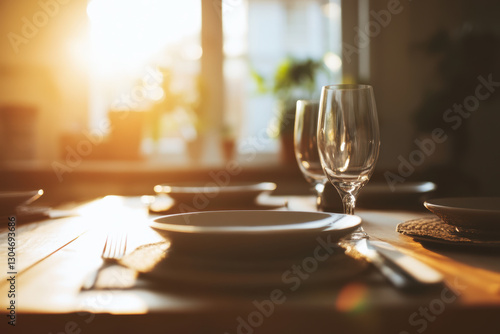 Sunlit dining table setting with glassware and plates against a backdrop of bright interior