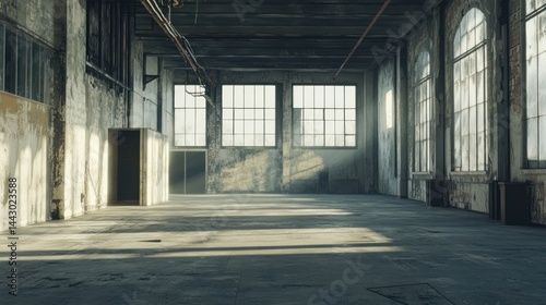 Sunlit, empty industrial warehouse interior with grunge walls, large windows, and concrete floor.