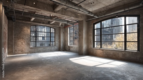 Sunlit empty loft space with exposed pipes and concrete walls