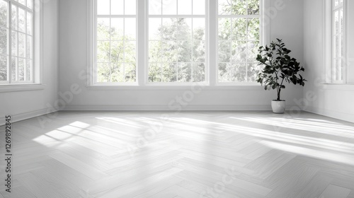 Sunlit empty room, hardwood floor, plant, windows, interior design