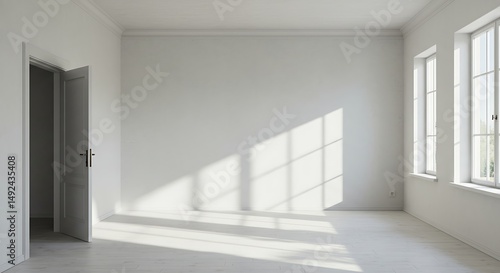 Sunlit Empty Room: Minimalist Interior with Open Door and Windows