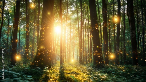 Sunlit enchanted forest path, magical fireflies, summer evening, fantasy background, ideal for fairytale illustrations