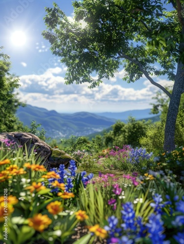 Sunlit Flower Path with Mountainous Vista - Peaceful and inviting path through a flower garden with a beautiful view of distant mountains and clear skies