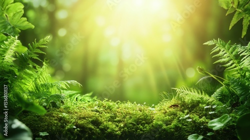 Sunlit Forest Floor with Vibrant Green Ferns and Moss