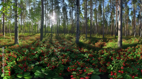 Sunlit forest glade panoramic view of ripe strawberries amid lush green landscape