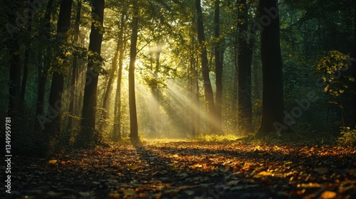 Sunlit Forest Path: A mystical forest scene with sunbeams streaming through towering trees, illuminating a path and creating a magical ambiance.
