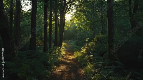 Sunlit forest path at dawn, nature trail, peaceful woods, tranquil scene, background foliage