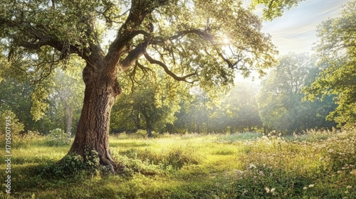 Sunlit forest scene with an old, majestic tree. Golden light illuminates the peaceful meadow and lush foliage.