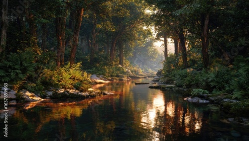 Sunlit forest stream. Lush greenery, calm water reflects trees