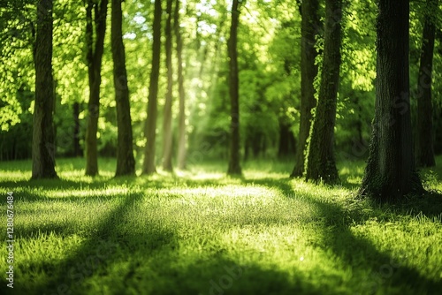 Sunlit Forest with Lush Green Grass and Tree Shadows in a Tranquil Natural Setting