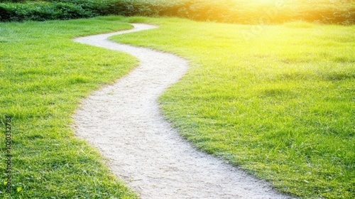 Sunlit garden path with lush green grass and a dirt walkway, creating a serene and peaceful outdoor scene. Tranquility and nature concept.